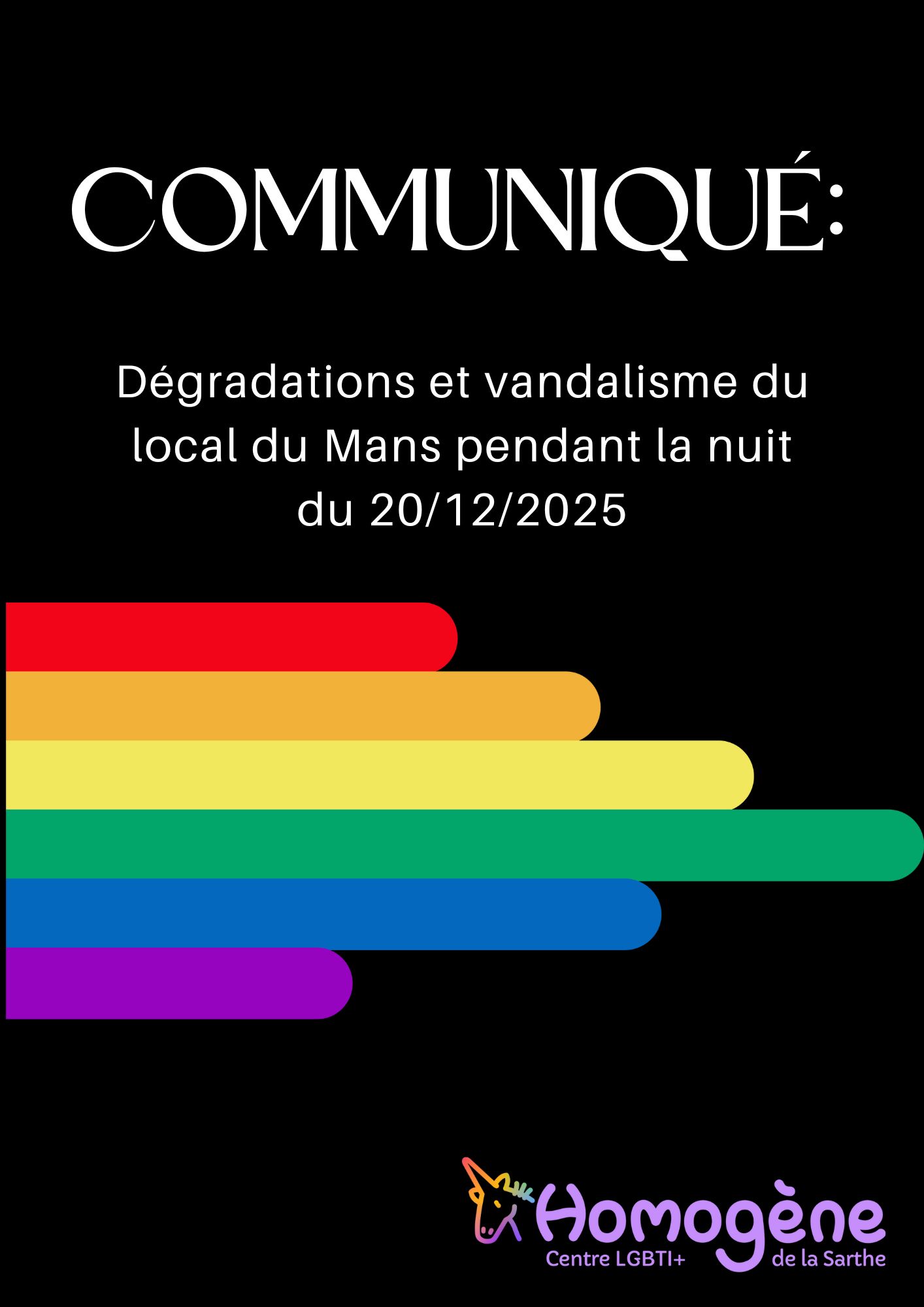 Le weekend du 20 décembre, le local du Mans de notre association a été dégradé. Les agresseurs n'ont pas hésité à signer leur geste en collant des autocollants idéologiques d'extrême droite et fascistes. Ils ont tenté d'arracher les vinyles arc-en-ciel présents sur nos vitres.
